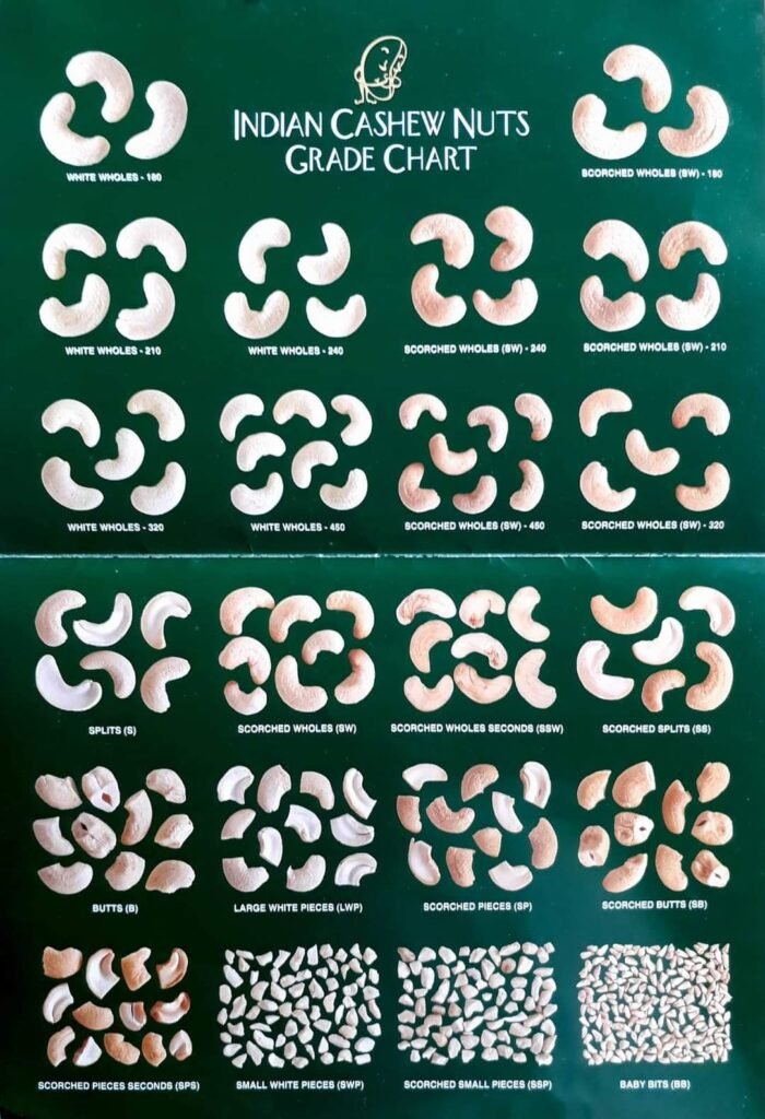 Detailed specifications of export-quality cashew kernels across all grades and categories.